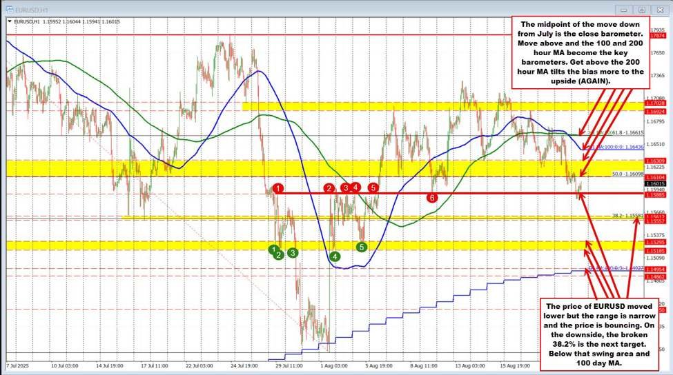 EURUSD: The EURUSD heads into Powell’s Jackson Hole speech with a bearish tilt, as the pair trades below the 100- and 200-hour moving averages as well as the midpoint of the move down from the July 1 high. These technical levels are acting as firm resistance and keep sellers in control. Unless price action can reclaim and hold above those moving averages, the bias remains more to the downside, with traders eyeing initial support near the broken 38.2% retracement level at 1.1558. Below that, and a swing area down to 1.15185 and the longer term 100 day MA become the targets. A more hawkish-than-expected tone from Powell could reinforce the downside pressure, while a dovish surprise may spark a corrective push higher into those key moving average barriers.