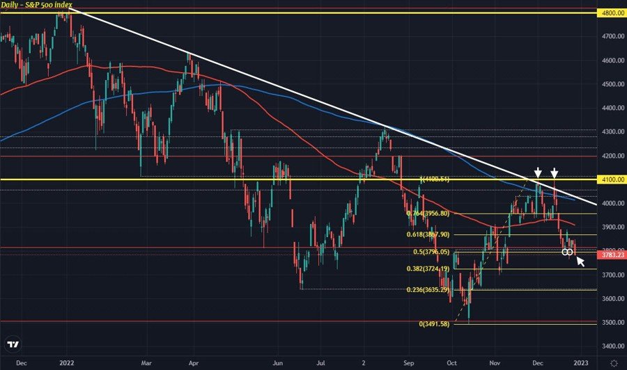 The over 1% drop in the S&P 500 yesterday saw a daily close below its 50.0 Fib retracement level of the swing higher from October, seen at 3,796. That has been a level limiting further downside in the past week, before we headed into the Christmas break.