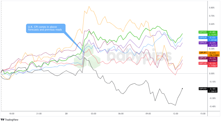 The British pound was already seeing green before shooting up on the higher-than-expected inflation print. This reaction shouldn’t be a surprise as the rise in inflation rates–particularly in the services sector–suggests that inflationary pressures are not easing as quickly as the Bank of England might have hoped.