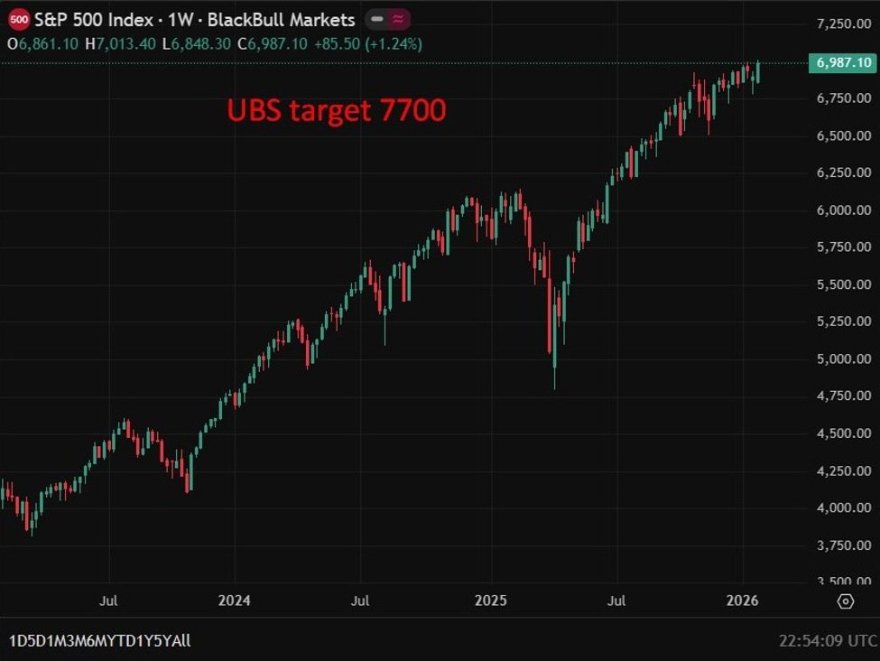 UBS reaffirmed its 7,700 year-end target for the S&P 500, maintaining a constructive outlook for U.S. equities.