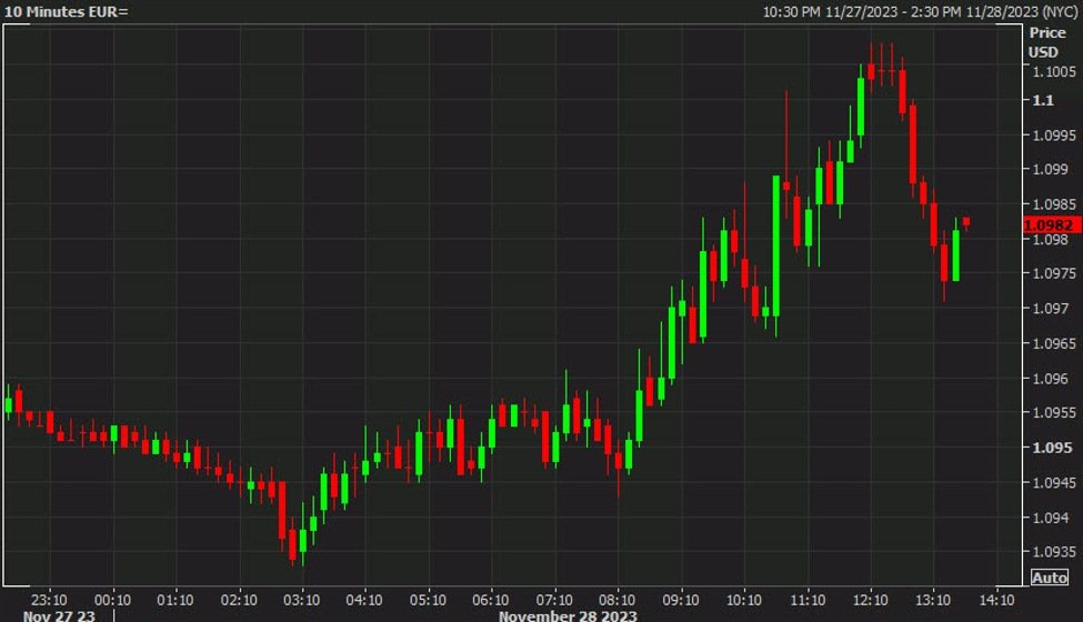 EUR/USD managed to crest above 1.10 but has since sagged to 1.0982.