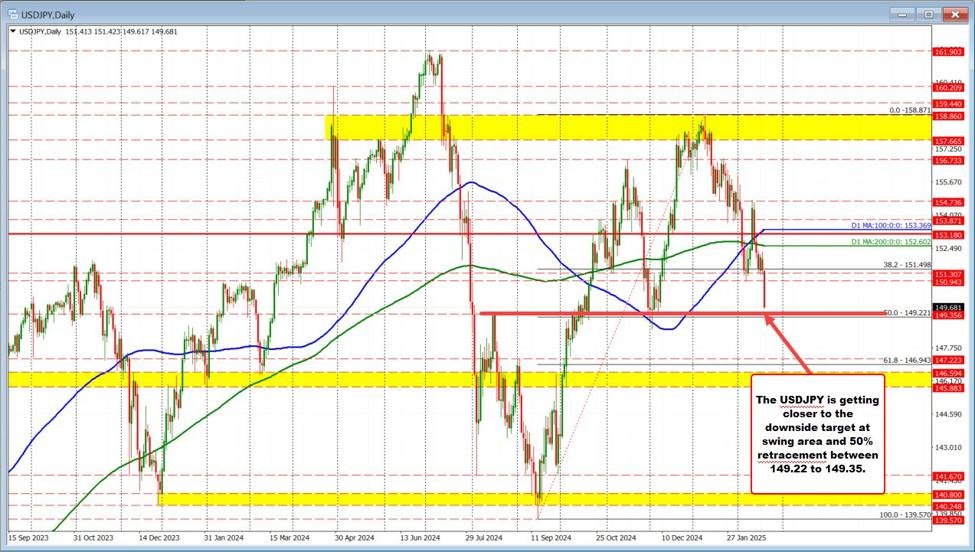 USDJPY. The USDJPY is trading to a new low of 149.62. That is getting closer to the 50% midpoint of the move up from the September low which comes in at 149.22. There is a swing level near 149.35 just ahead of that midpoint level.