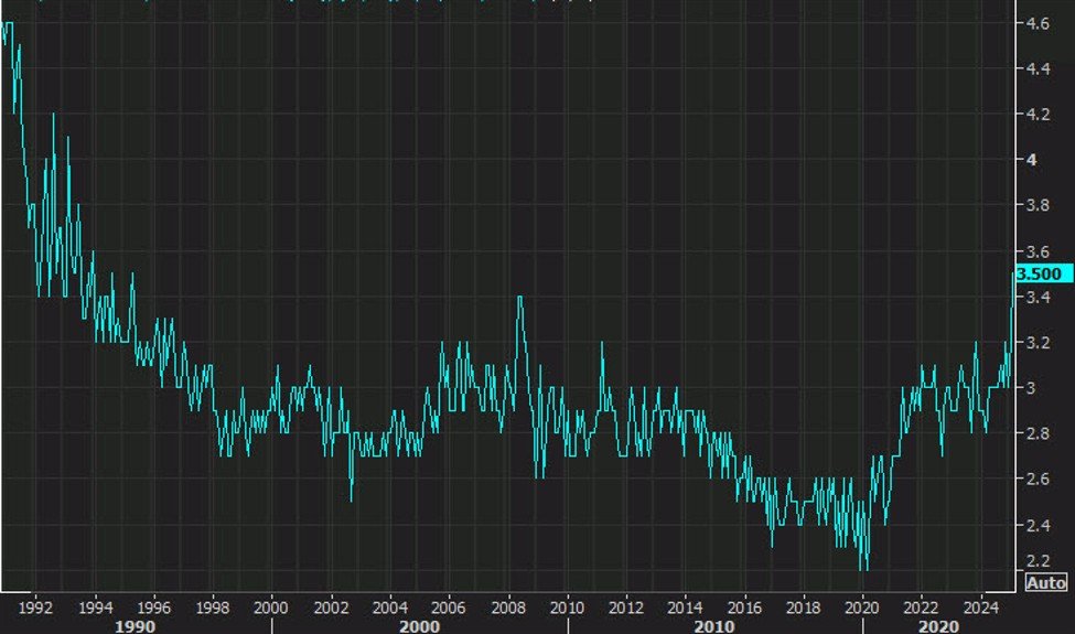 In any case, since then the tariff talk certainly hasn’t cooled the flames of inflation. Now here we are with long-term inflation expectations in the UMich survey at the highest since the 1990s.