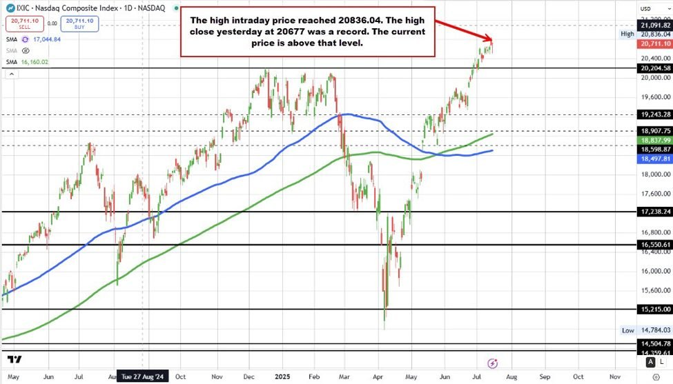 For the S&P index, it is up 12.21 points or 0.19% at 6255.87. It’s record close was back on July 10 at 6280.46. The price is some 25 points away from that record level. At session lows, the index was now -42.17 points.