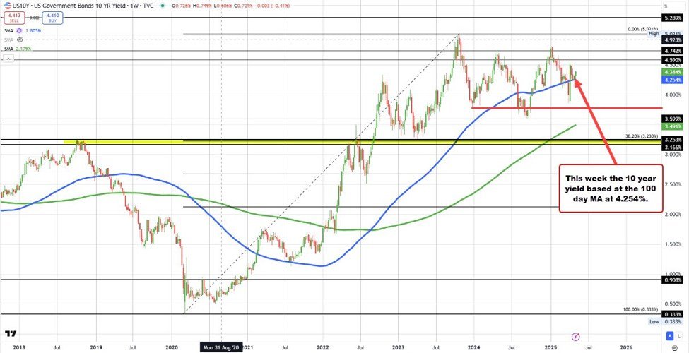 Looking at the 10-year yield, the 100-day moving averages at 4.254%. The yield low this week reached 4.260% just above the moving average level.