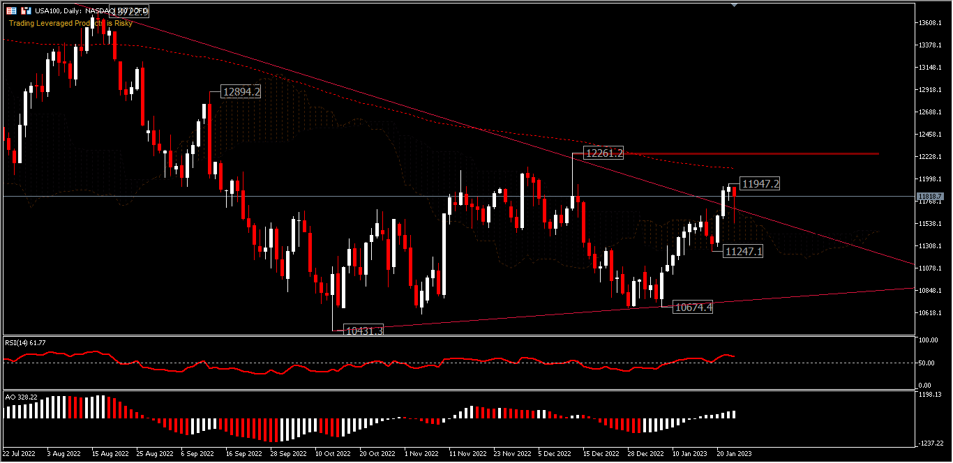 The USA100 gave back most of its losses by registering a rise of 1.76%. The consolidation from the 10,431 (61.8%FR) rebound is still ongoing below the 12,261 resistance and 200-day EMA. It is important for the USA100 to move above the 12,261 resistance to confirm the rebound rally so that it can continue up to 12,894 and 13,722. Otherwise, the outlook remains in a consolidation zone. While a move below the 10,431 support will continue the decline from the 16,767 peak to deeper levels. RSI is at 61 and not yet overbought, while AO is in the buy zone.
