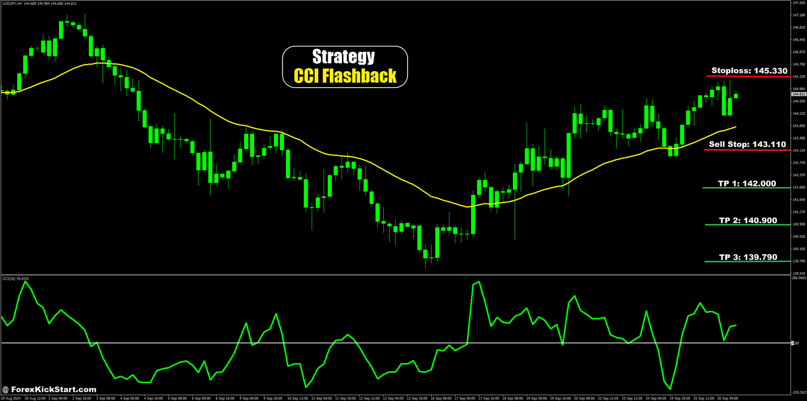 Currently, the CCI Flashback strategy has identified a trading opportunity on the USD/JPY pair within the H4 timeframe. I’ve shared a trade setup image for your reference. The details of the trade are as follows: