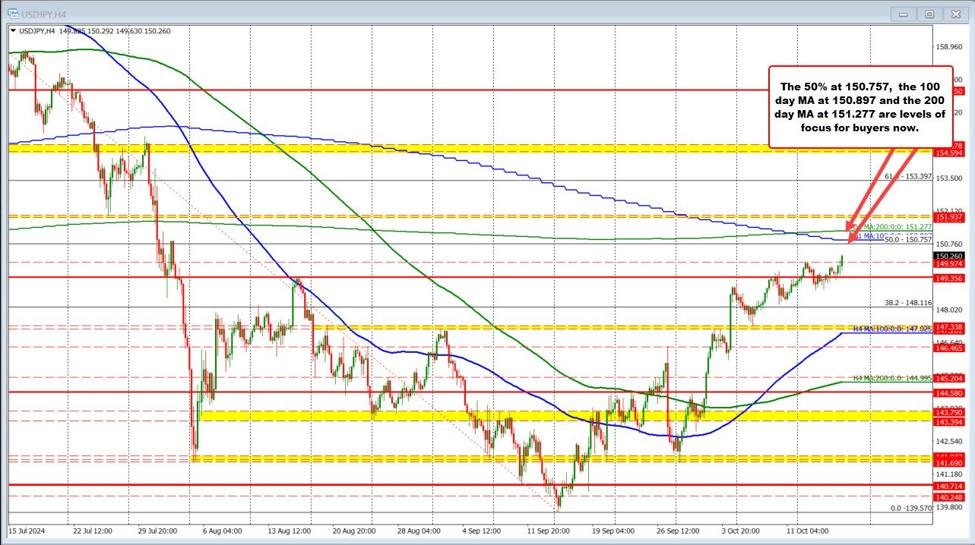 The price of the USDJPY has traders now focused on other targets above including the 50% midpoint of the move down from the July high. That comes in at 150.757. Above that, the falling 100-day MA comes in at 150.897 and the 200-day MA comes in at 151.277.