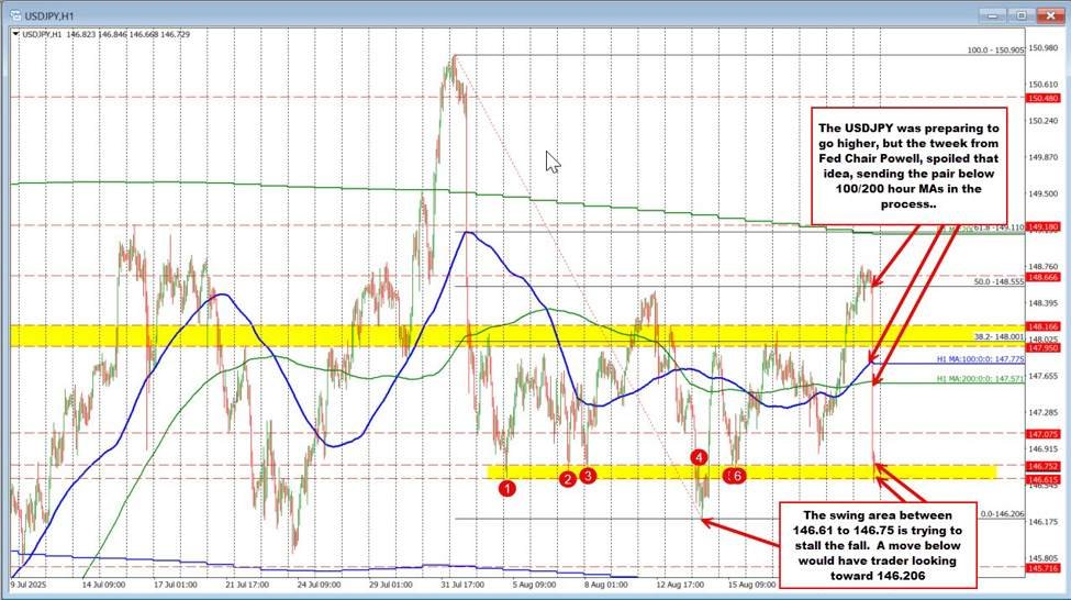 The USDJPY fell sharply, breaking decisively below the 100-hour moving average at 147.775 and the 200-hour moving average at 147.57 (blue and green lines). That move immediately stripped away the bullish bias from a technical perspective and shifted control firmly to the sellers.