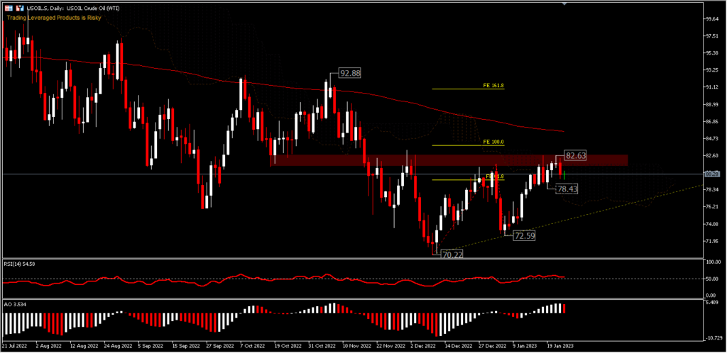 USOil today has been trading around $80.00. The previous day, we saw an evening star candle pattern forming in the resistance zone and gains are likely to be capped by the 200 day EMA around $85.00. Current bias remains neutral with a chance that a break of the resistance at $82.63 will extend the rebound at $70.22 to a higher level. The price is currently in a bearish Kumo which is starting to look thin, with the RSI hovering above the 50 level and AO on the buy side.