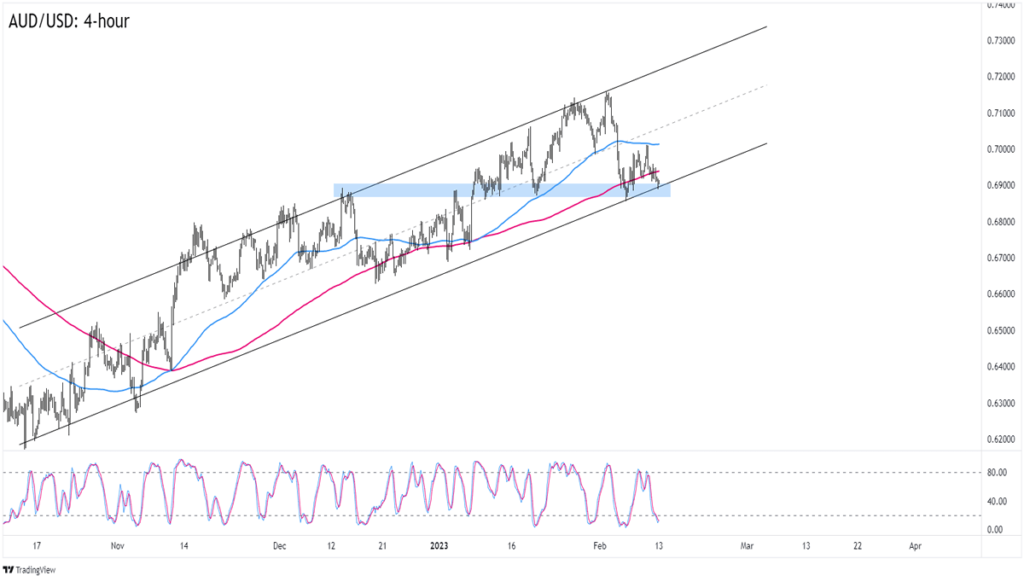 AUD/USD is trading at the .6900 zone, which is juust above an ascending channel support that’s been around since mid-October.