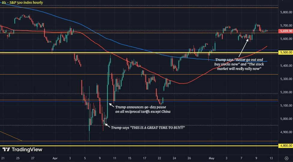 And now, markets are rallying further as the US and China lower tariffs in favour of discussions – at least for the next 90 days. S&P 500 futures up over 2.5% on the day, we’re slated to open just above the 5,800 mark. If that holds, Trump’s message from Thursday last week will again yield another positive follow through.