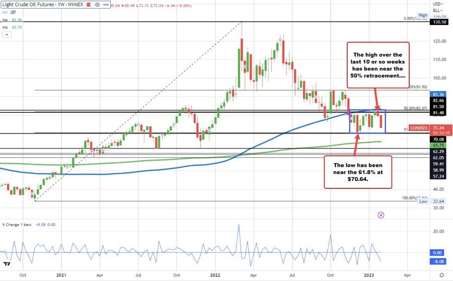 Taking a broader look at the weekly chart, the price of crude oil has been moving up and down since November 21 week. Since that week, the price has seen resistance near the 50% of the move up from the November 2020 low near $82.07 (the high reached $82.64), and support near the 61.8% of the same move at $70.84 (the low dipped to $70.08). The 100 week MA at $83.36 is also a key level that the price has been able to stay below since breaking on the week of November 14, 2022.