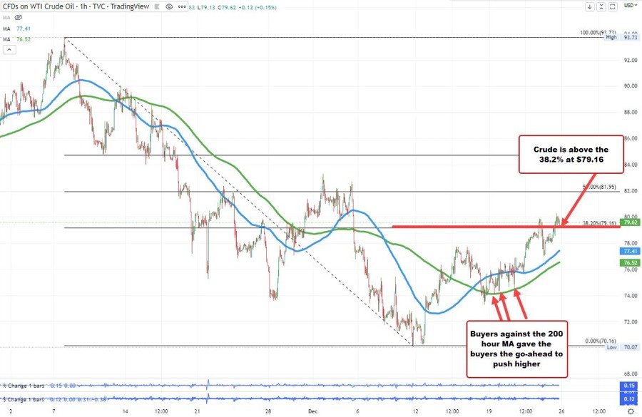 The rising 100 hour moving average is down at $77.4, and the rising 200 are moving averages at $76.52. Earlier this week, the price tested that 200 hour moving average and found successive buyers against the level. That gave the buyers the go-ahead to push the price to the upside from a technical perspective.