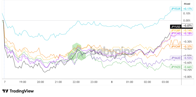 The currency managed to pull higher as the session progressed, moving tentatively sideways a few hours before London markets opened. Still, JPY remained broadly in the red, chalking up its largest losses to NZD (-0.66%) and AUD (-0.53%) while limiting declines against USD (-0.07%) and GBP (-0.14%).